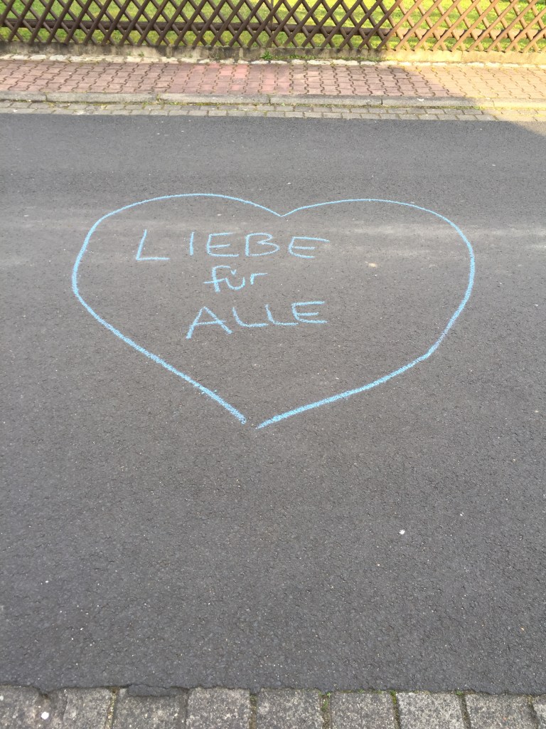 Und so ging ich dann am nächsten Abend gegen 22.00 mit aller Malkreide meiner Kinder, die ich finden konnte, aus dem Haus um Herzen auf die Straßen zu malen. (Zu der Zeit war der erste Schwung aAngst unter uns Menschen zu spüren, aber man war noch nicht in der Bewegung eingeschränkt). Ich fuhr also an die Orte, an denen mehr Menschen vorbeikommen.. Supermärkte, Bank, Bäckerei, Friedhof und auch einfach vor grossen Wohnhäusern. Während ich die Herzen auf die Straße malte, war ich fast schon etwas aufgeregt, entdeckt zu werden, es machte aber auch unheimlich viel Spaß😄 so gut wie danach habe ich schon lange nicht mehr geschlafen.
